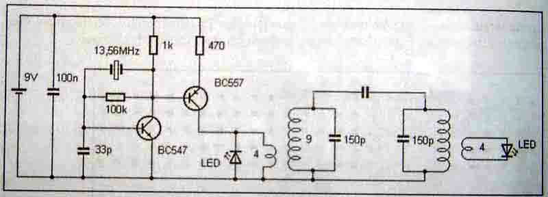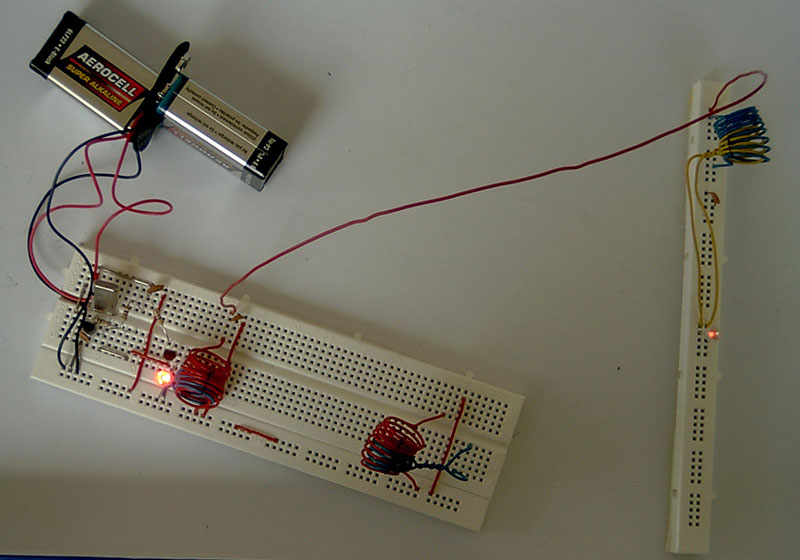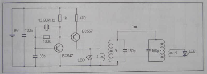 Ключевым элементом схем являются два симметричных LC-контура которые работают на частоте кварца 13.56 Мгц. Мне удалось настроить контура так чтобы два светодиода светились и беспроводно и на одном проводе. Наблюдаются все эффекты о которых говорил Тесла, например первый контур чувствует если второй вышел из резонанса (1й светодиод светится ярче если второй затухает). Удалось передать энергию по одому проводу на расстояние в 1 метр. Беспроводно получилось на сантиметров 15ть (больше пока не пробовал). 10сантиметровые антенны как рекомендуется в схеме не работали, а заработало когда подключил толстые шурупы. Металических шаров не нашел. Но по видиму важна емкостная связь контуров. Очень важна также настройка катушек.