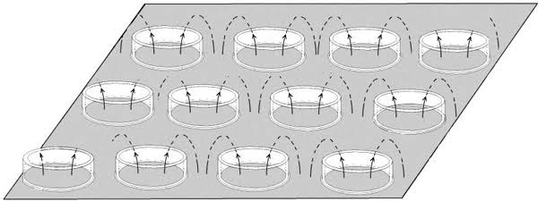 В данном случае, мы рассматриваем кулоновские силы между несколькими диэлектрическими одноименно заряженными элементами: плоским электродом (основанием) и множеством цилиндрических заряженных элементов (трубок). Благодаря тому что силы, действующие на поверхность электрически заряженного диэлектрика, всегда перпендикулярныы поверхности, силы F21, действующие на пластину – основание, сонаправлены и суммируются. В то же время, силы, действующие на каждый цилиндрический элемент F12, с разных сторон, взаимно компенсируются. Эти особенности предлагается использовать для конструирования электрических движителей, создающих активную силу за счет ненулевой векторной суммы кулоновских сил. Современные нанотехнологии позволяют реализовать концепцию, показанную на рис. 76, с помощью диэлектрических элементов малого размера, 100–200 нм. При таких размерах, кулоновские силы будут эффективно действовать на малых расстояниях при небольших напряжениях.
