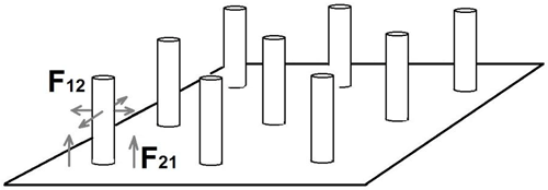 В данном случае, мы рассматриваем кулоновские силы между несколькими диэлектрическими одноименно заряженными элементами: плоским электродом (основанием) и множеством цилиндрических заряженных элементов (трубок).