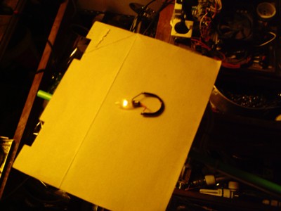 Решил посмотреть - будет ли гореть лампочка если её закоротить медной подковой(типа , как у Тесла ...) . Взял шинку /размеры засекреченные ! )из чисто немецкого трансформатора (я его с мусорки приволок за пузырь белой)...