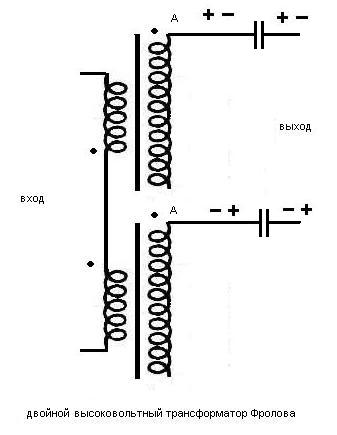Надо проверять... По моему, надо концы А+ и А- высоковольтных обмоток соединять с конденсаторами последовательно. Создаем сначала поляризацию, а не ток проводимости. Поляризация накопителя зарядов даст ток, который потом можно использовать в полезных целях.