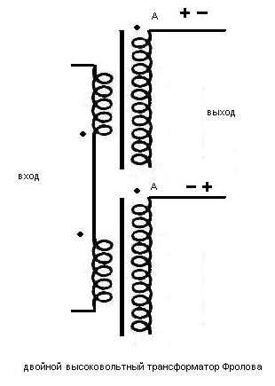 4. Разнесли их, чтобы не пробивало и включили первички противофазно. Получим противофазные переменные потенциалы на выводах А высоковольтной обмотки