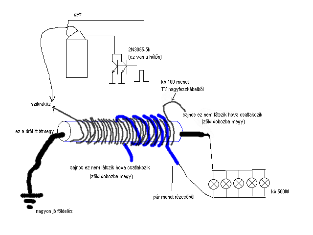 Принцип работы самого устройства 1:1 схож с установкой Тесла, только ВВ часть заменена электроникой и частоты более низкие ввиду использования больших емкостей и менее массивных, но многожильных проводников (ну откуда псевдо-архитектору знать по скин-эффект ?!) Примерную схему для повторения я уже дал, могу для ясности приложить вид намотки его катушки, больше там секретов нет. Все остальное - заземление, искровой пробойник вы видели. Да и еще - резонансов там нет, по крайней мере критичных для генерации доп. мощности.